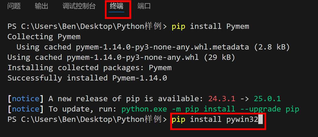 输入pip install pywin32 ,按回车,等待 pywin32 库安装成功