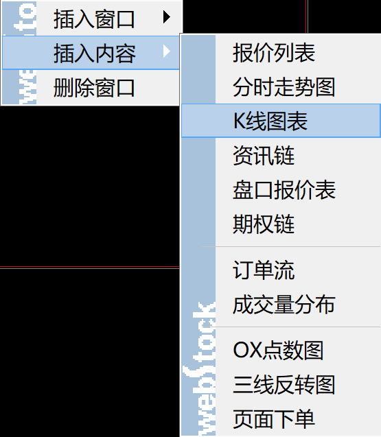 在空白的窗口框中依次点击右键选择 插入内容 – K线图表