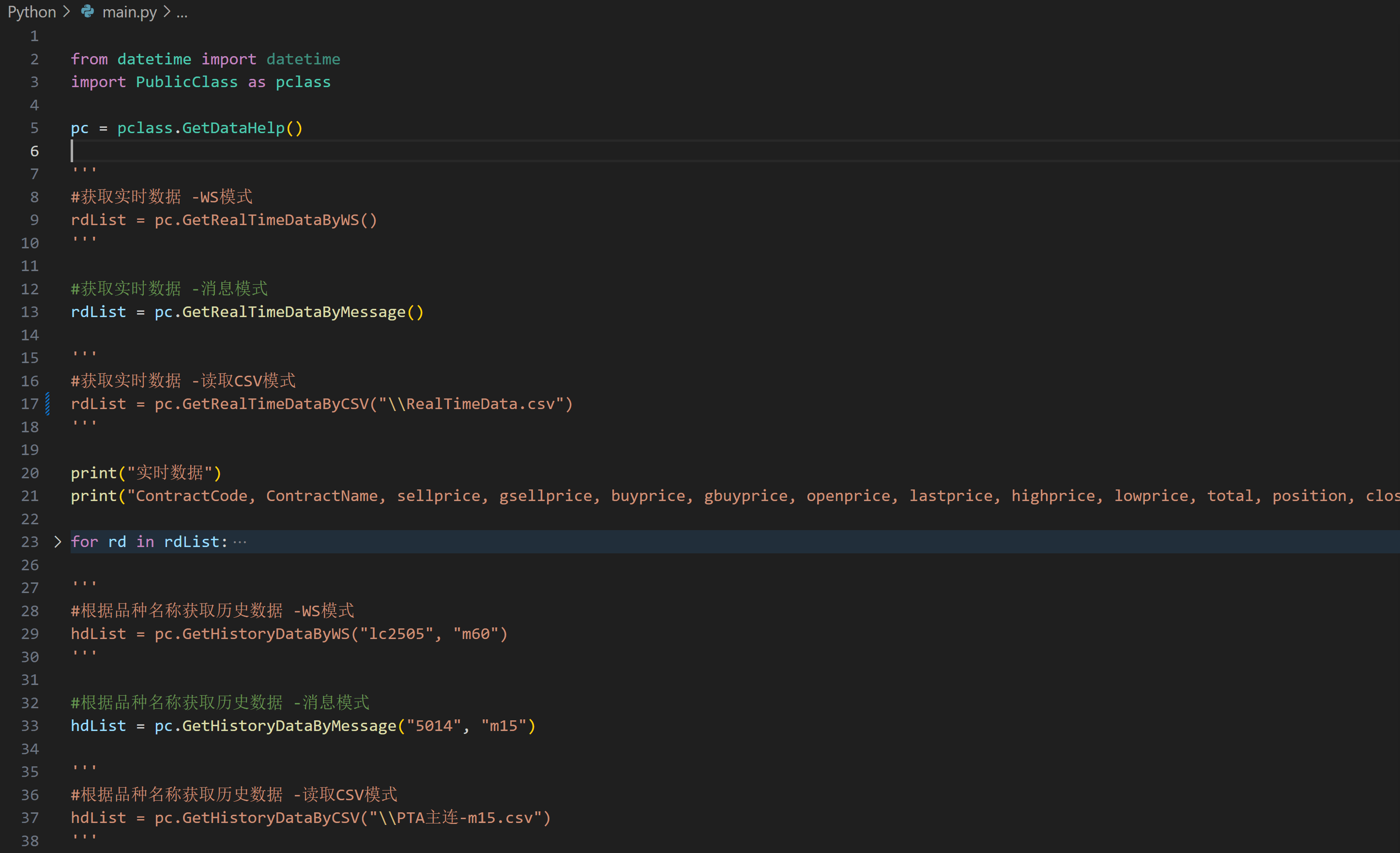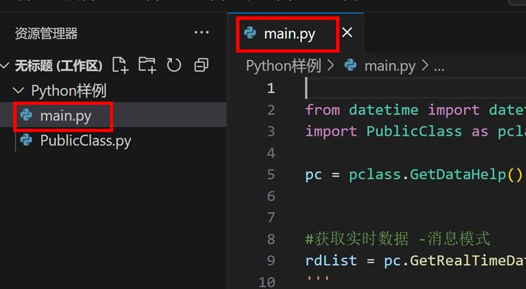 这里就已经完成了源码的加载,现在只需要修改您要显示的品种名称,然后选择右上角的向下箭头,选择 Python 调试程序:调试 Python 文件 便可进行调试