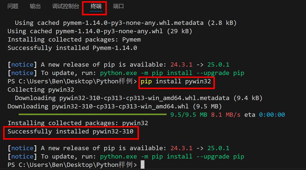 输入pip install pywin32 ,按回车,等待 pywin32 库安装成功