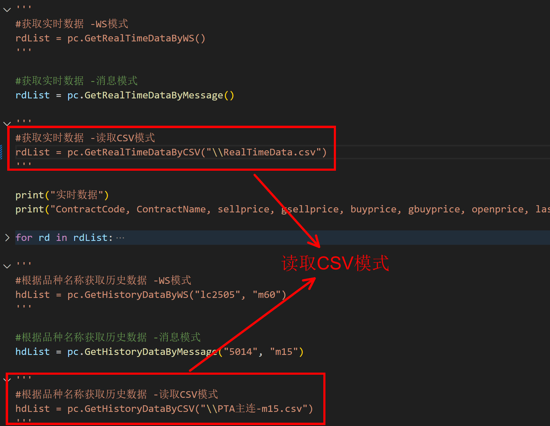 1. 通过读取数据文件方式:数据文件夹中RealTimeData.csv文件为实时数据文件,更新频率为1秒,其它的数据文件均为历史数据文件,命名方式为:合约名称-数据周期.csv(豆粕2505-m1.csv),更新频率为3秒,代码读取文件必须为只读模式,如果带有写模式会造成资源争抢导致程序出错,以Python为例,如下图: