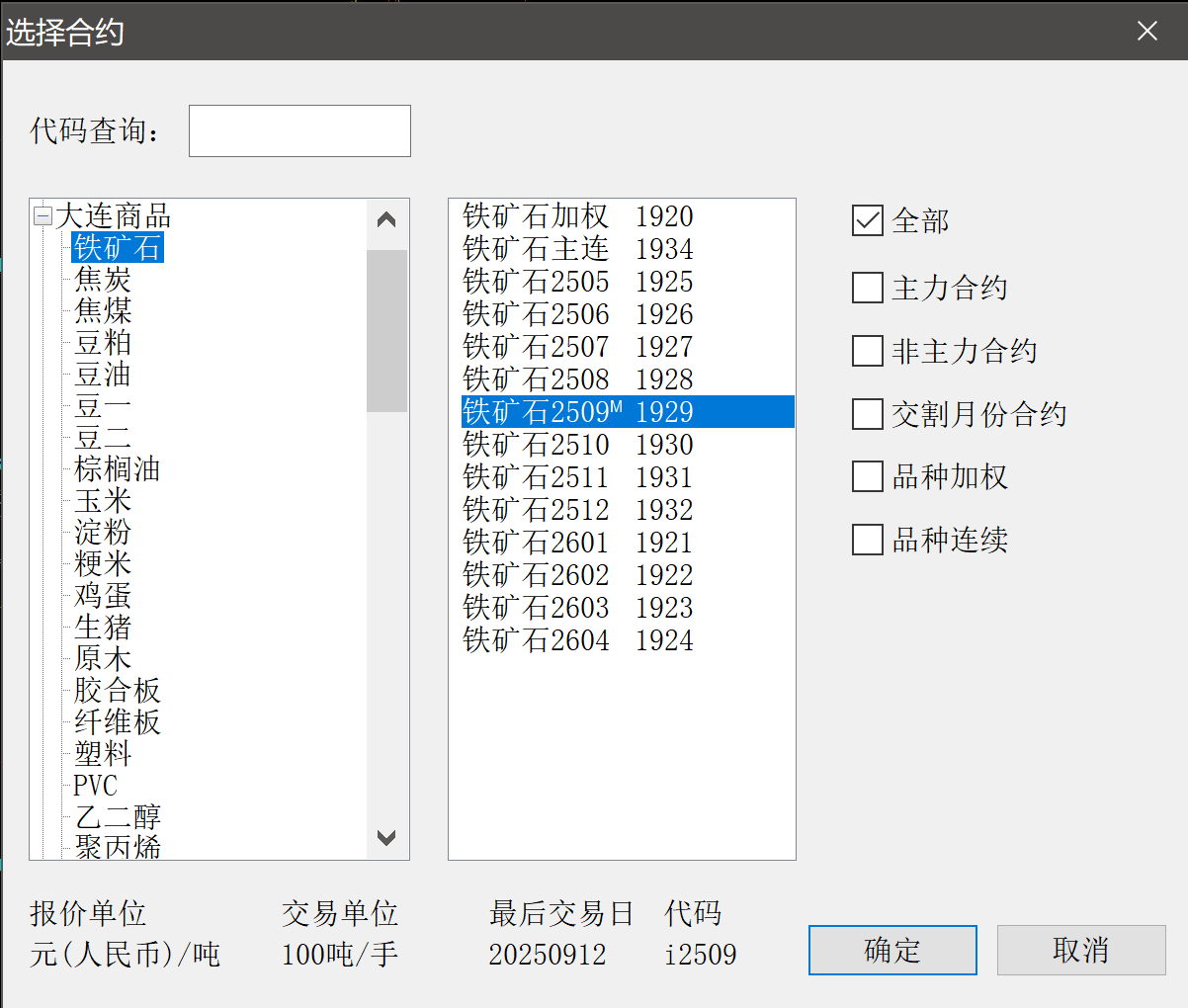 选择要在界面上显示的合约后点击确定