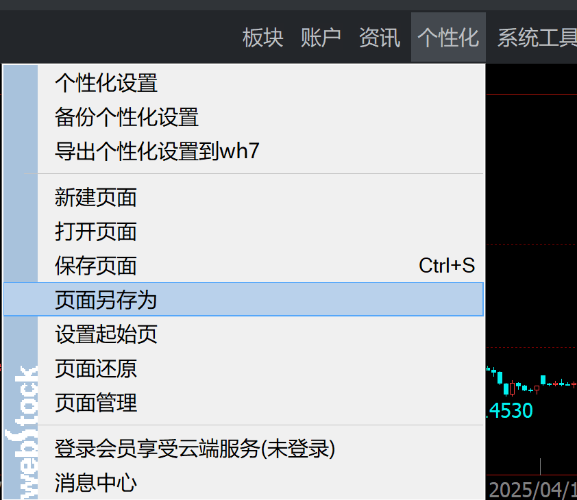 依次替换好需要的品种合约后,点击菜单 个性化 – 页面另存为