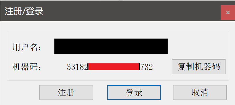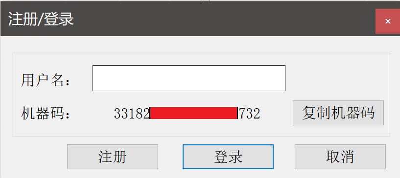 填入用户名后点击注册按钮进行用户注册,其中机器码为自动生成无需输入,注册成功或失败都会有相应的提示信息,一台机器的机器码只能成功注册一次,如已有相同的用户名或机器码已成功注册过则会提示注册失败。