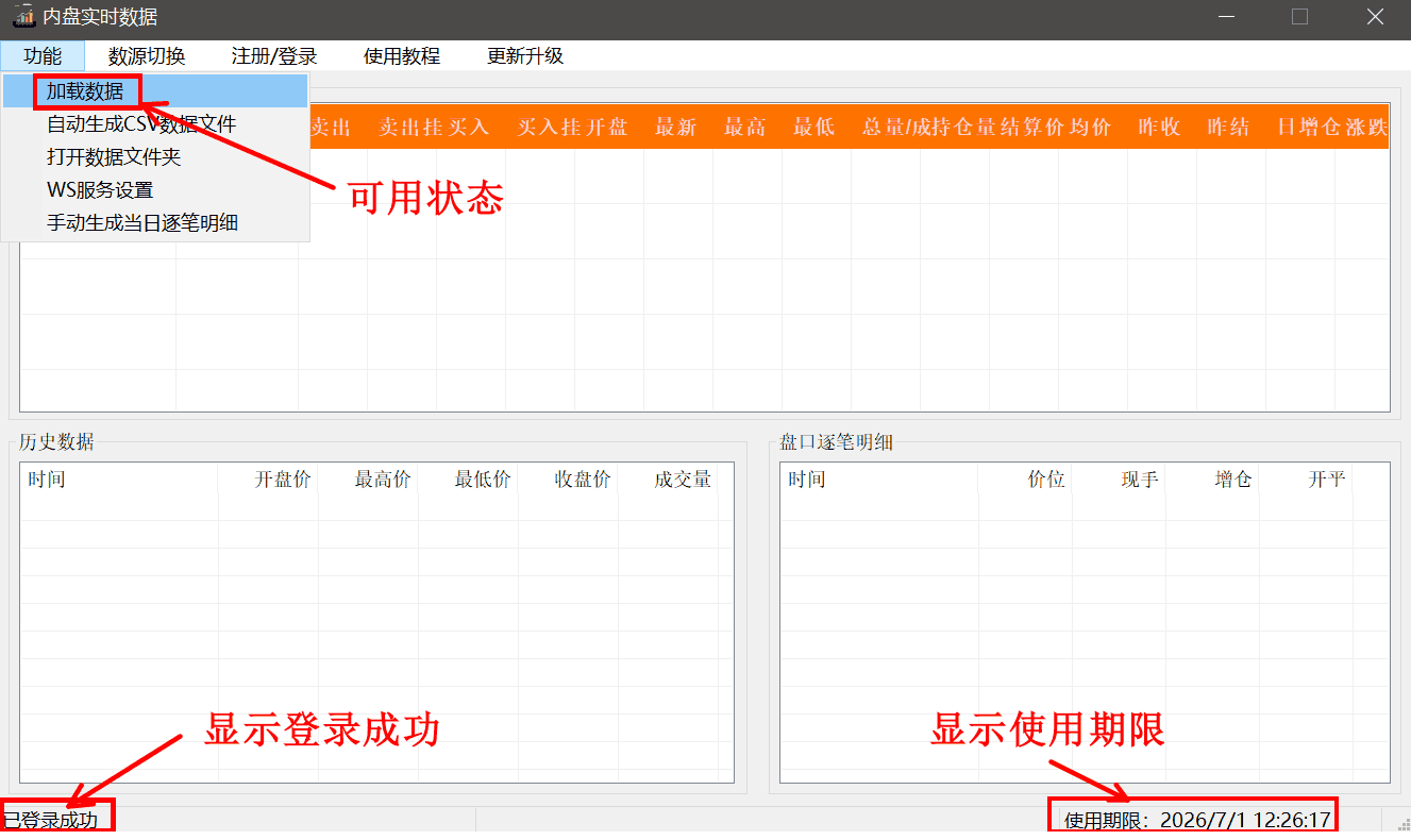 登录成功会有相应的弹窗与软件上状态档的提示,加载数据按钮变为可用状态,登录操作只需要操作一次,以后重新启动软件会自动进行登录。