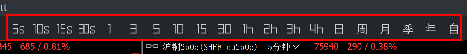 其中K线周期 m5 表示为5分钟,m60为1小时,m120为2小时,d1为1日,大写的M1为1个月,q1为1季,y1为1年,s5为5秒,以此类推