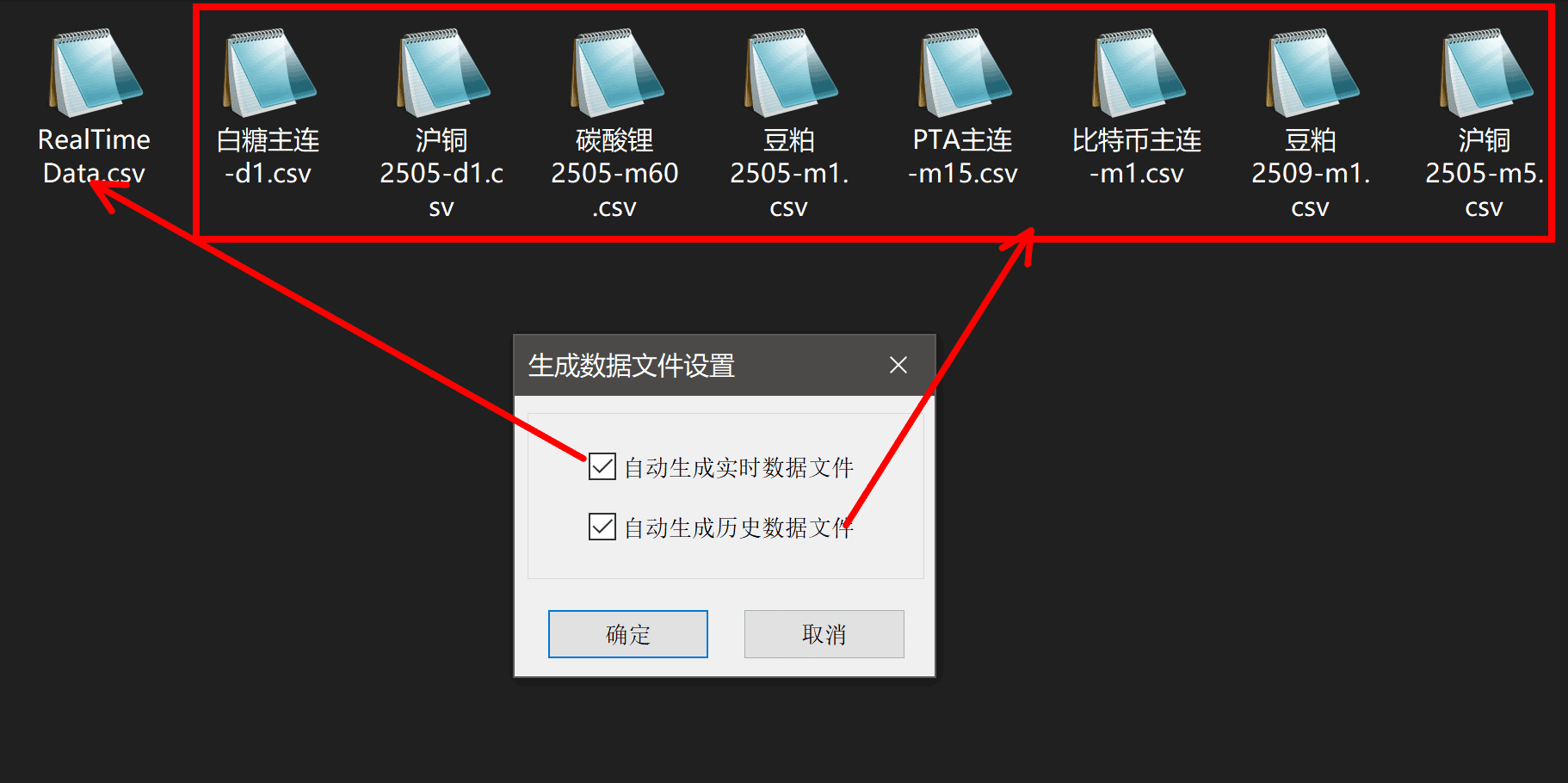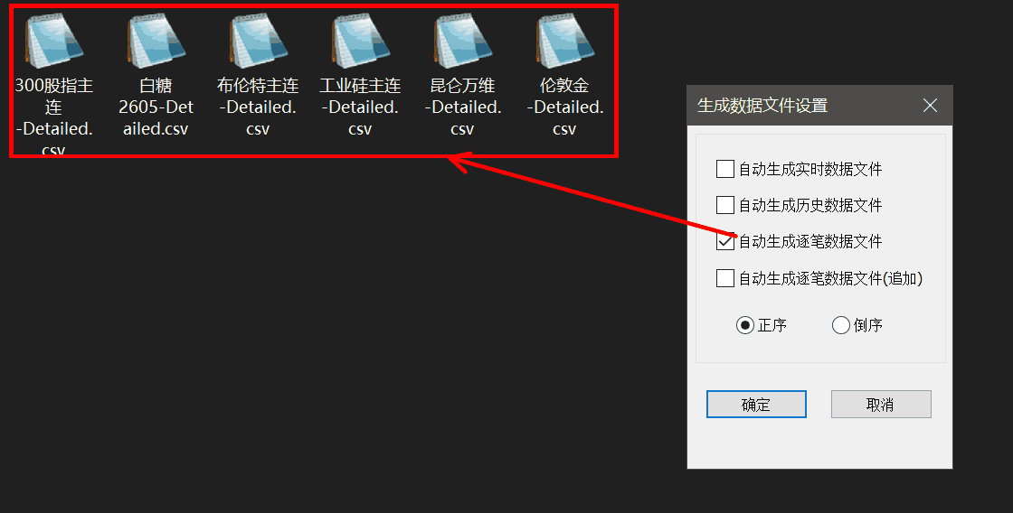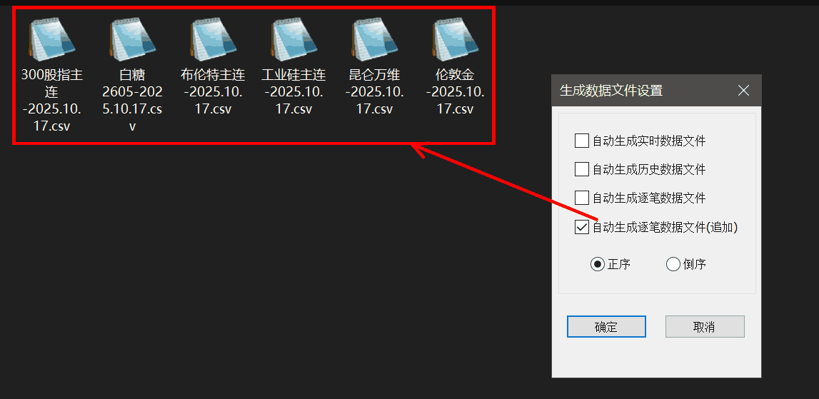 点击工具上的 打开数据文件夹 按钮则会弹出数据所在的文件夹,文件命名方式:品种名称-当前日期.csv