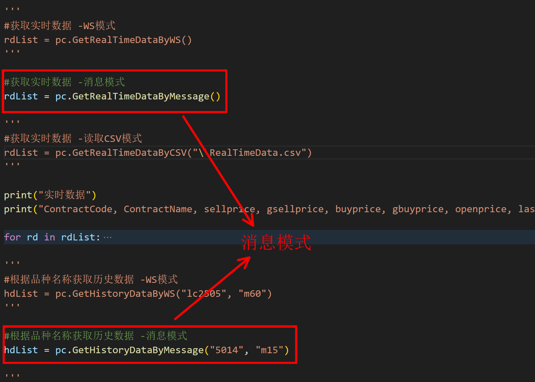2. 通过发送消息方式:该方式下获取数据的频率可自行通过代码设置,实时数据在软件中的更新频率为200ms一次,交易商发送的实时数据也为200ms左右一次,所以不需要小于200ms获取一次,获取频率太快会增加软件与CPU的负担,也是一种资源的浪费,历史数据在软件中未设置更新频率,一般一分钟的历史数据3秒左右获取一次即可,以Python为例,如下图: